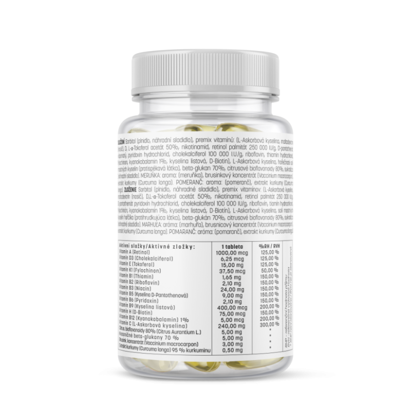 Sorbitol, Vitamin Premix: (Acid L-Ascorbic, Maltodextrină, Acetat de D,L-α-Tocoferol 50%, Nicotinamidă, Palmitat de Retinol 250.000 UI/g, D-Pantotenat de Calciu, Clorhidrat de Piridoxină, Colecalciferol 100.000 U.I./g, Riboflavină, Clorhidrat de Tiamină, Filochinonă, Cianocobalamină 1%, Acid Folic, D-Biotină), Acid L-Ascorbic, Aromă: (portocaliu), Săruri de magneziu ale acizilor grași (antiaglomerant), Beta-Glucan 70%, Bioflavonoide Citrice 80%, Sucraloză (îndulcitor), Extract de Turmeric (Curcuma longa)