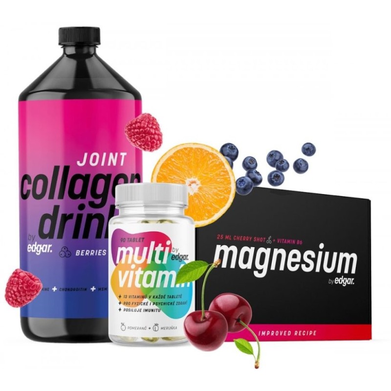 Un pachet mare de colagen premium care va avea grijă de buna funcționare a sistemului musculo-scheletic, va proteja articulațiile și cartilajele sau vă va ajuta să vă reveniți în formă după o accidentare. Adăugați la aceasta multivitaminele noastre de top, sub formă de tablete gustoase, masticabile, cu o formulă premium și atent gândită. Cireașa de pe acest tort sănătos este o cutie de zece fiole de magneziu Edgar.